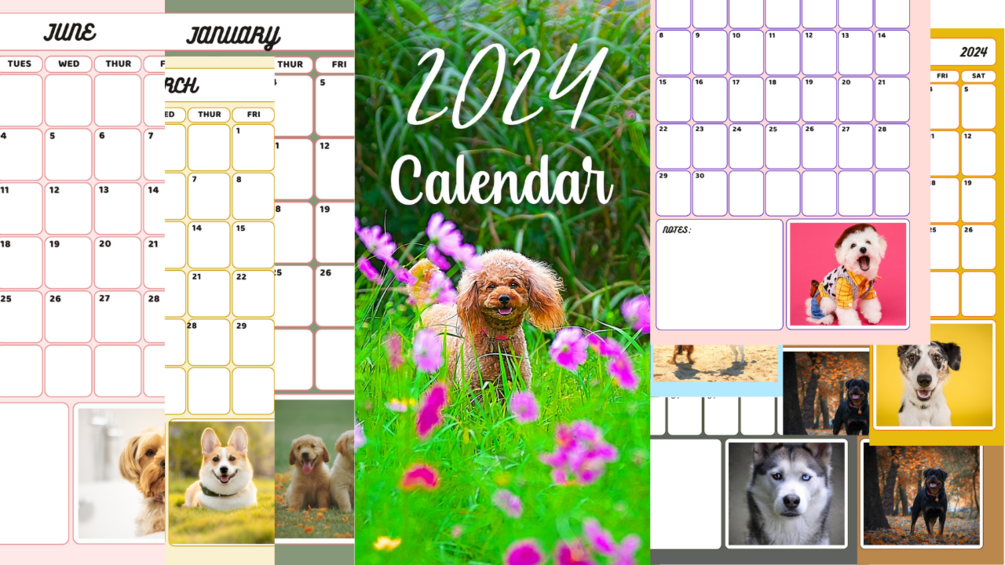 Dog Photos: Every month features a new high-quality photo of a different dog breed, capturing the essence and charm of man’s best friend.